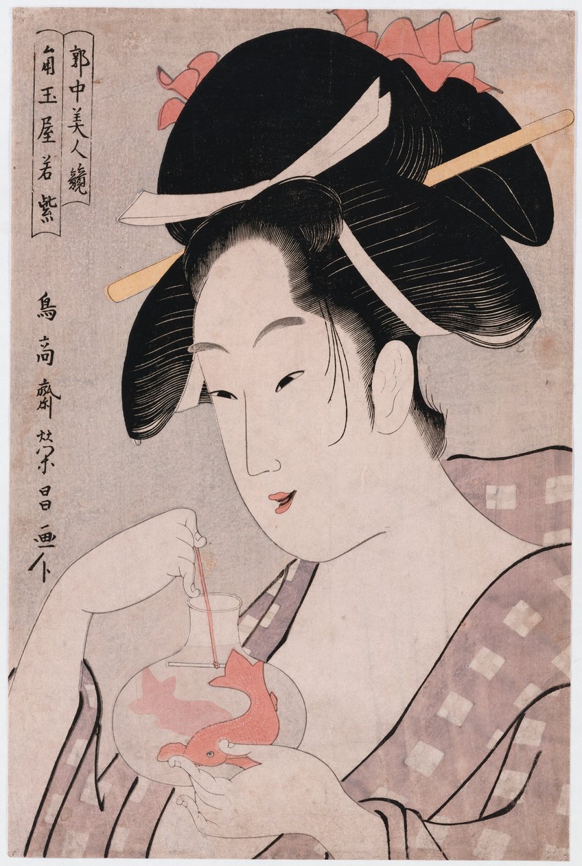 "लाइसेंस प्राप्त तिमाहियों में सुंदरियों की तुलना" श्रृंखला से एक सुनहरी-नीली पृष्ठभूमि के खिलाफ एक ग्लास कंटेनर में सुनहरी मछली के साथ खेलते हुए सुनातुमाया के सौजन्य वाक्मुरसाकी का एक बस्ट चित्र।(A bust portrait of the courtesan Wakamurasaki of the Tsunotamaya playing with goldfish in a glass containerset against a greyish-blue background, from the series "Comparison of beauties in the licensed quarters")चोकोसाई ईसो |
