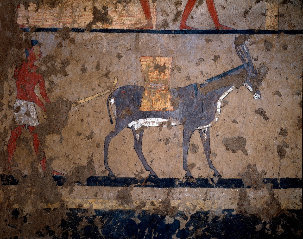 मिस्र का प्राचीन काल: "" खच्चर की पीठ पर अनाज का परिवहन""" 2200-2000 ईसा पूर्व राजा इति (या इट्टी) के चांसलर के मकबरे की दीवार की टेम्परा पेंटिंग। एल घेबेलेन, लक्सर से। ट्यूरिन, मिस्र का संग्रहालय(Egyptian antiquite: “” the transport of grain on the back of a mule””” Tempera painting of the wall of the tomb of the chancellor of King Iti (or Ity) 2200-2000 BC. From El Ghebelen, Luxor. Turin, Egyptian museum)मिस्र का मिस्र |