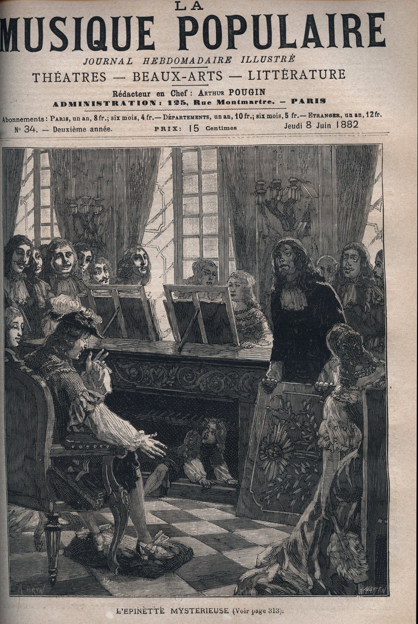 "एल एपिनेट मिस्टीरियस"" जीन बैप्टिस्ट रायसिन (१६५५-१६९३), ट्रॉयस के ऑर्गेनिस्ट, राजा को एक विशेष स्पिनेट (स्ट्रिंग इंस्ट्रूमेंट) प्रस्तुत करते हैं। स्पिनेट खोलने के उनके अनुरोध पर, ऑर्गेनिस्ट के युवा बेटे जीन बैप्टिस्ट राइसिन ने उपकरण छोड़ द(“L'Epinette mysterieuse”” Jean Baptiste Raisin (1655-1693), organist of Troyes, presents to the King a particular spinette (string instrument). At his request to open the spinette, Jean Baptiste Raisin, the young son of the organist, leaves the instrument )अज्ञात कलाकार |