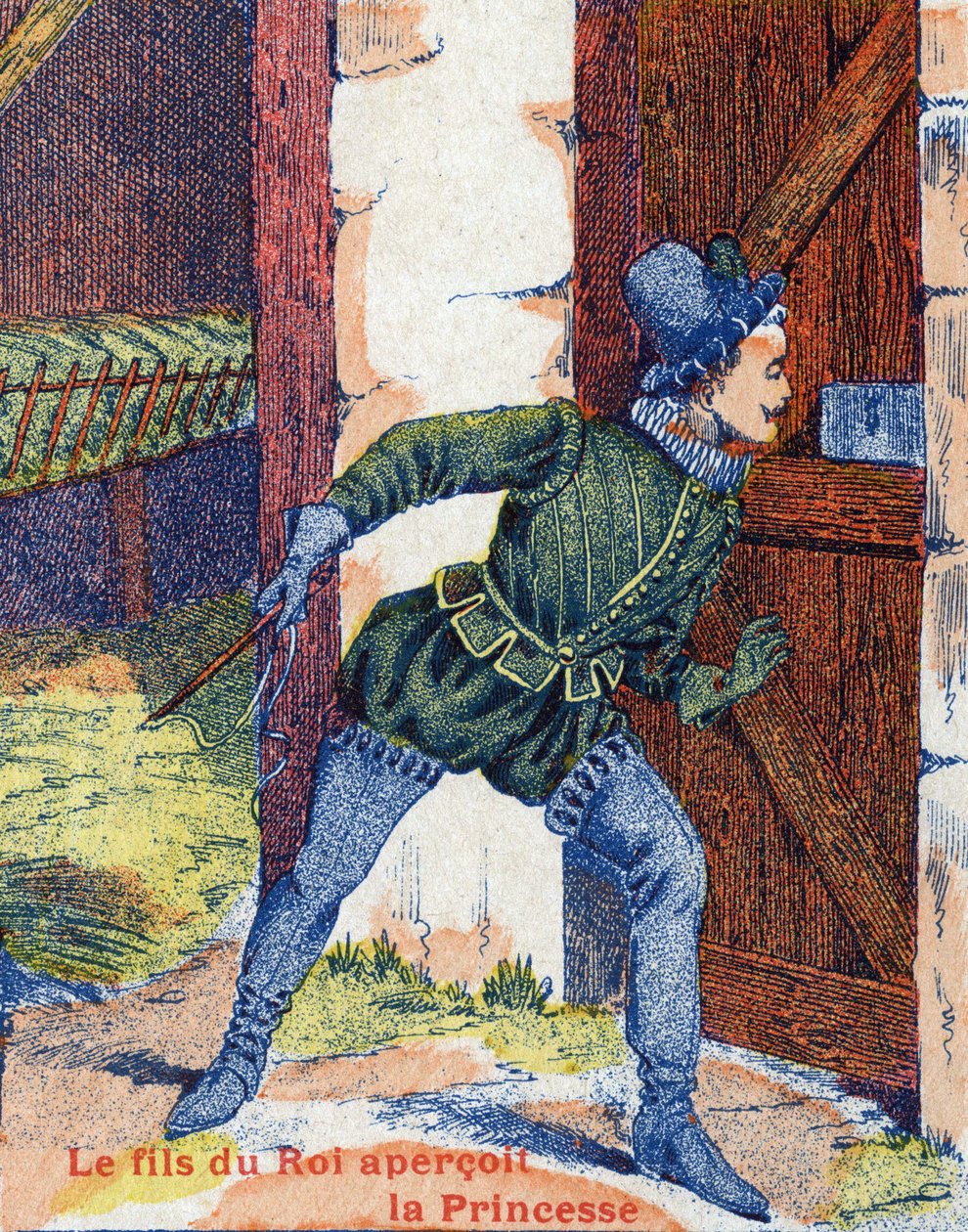 राजा के बेटे ने राजकुमारी को देखा। चार्ल्स पेरौल्ट (1628-1703), फ्रांसीसी लेखक द्वारा "" गधा त्वचा "" कहानी के लिए चित्रण। इमेजरी मार्सेल वाग्ने, जारविल नैन्सी, अदिनांकित (19वीं सदी के अंत में)।(The king's son saw the princess. Illustration for “” Donkey Skin”” tale by Charles Perrault (1628-1703), French writer. Imagery Marcel Vagne, Jarville Nancy, undated (late 19th century).)अज्ञात कलाकार |